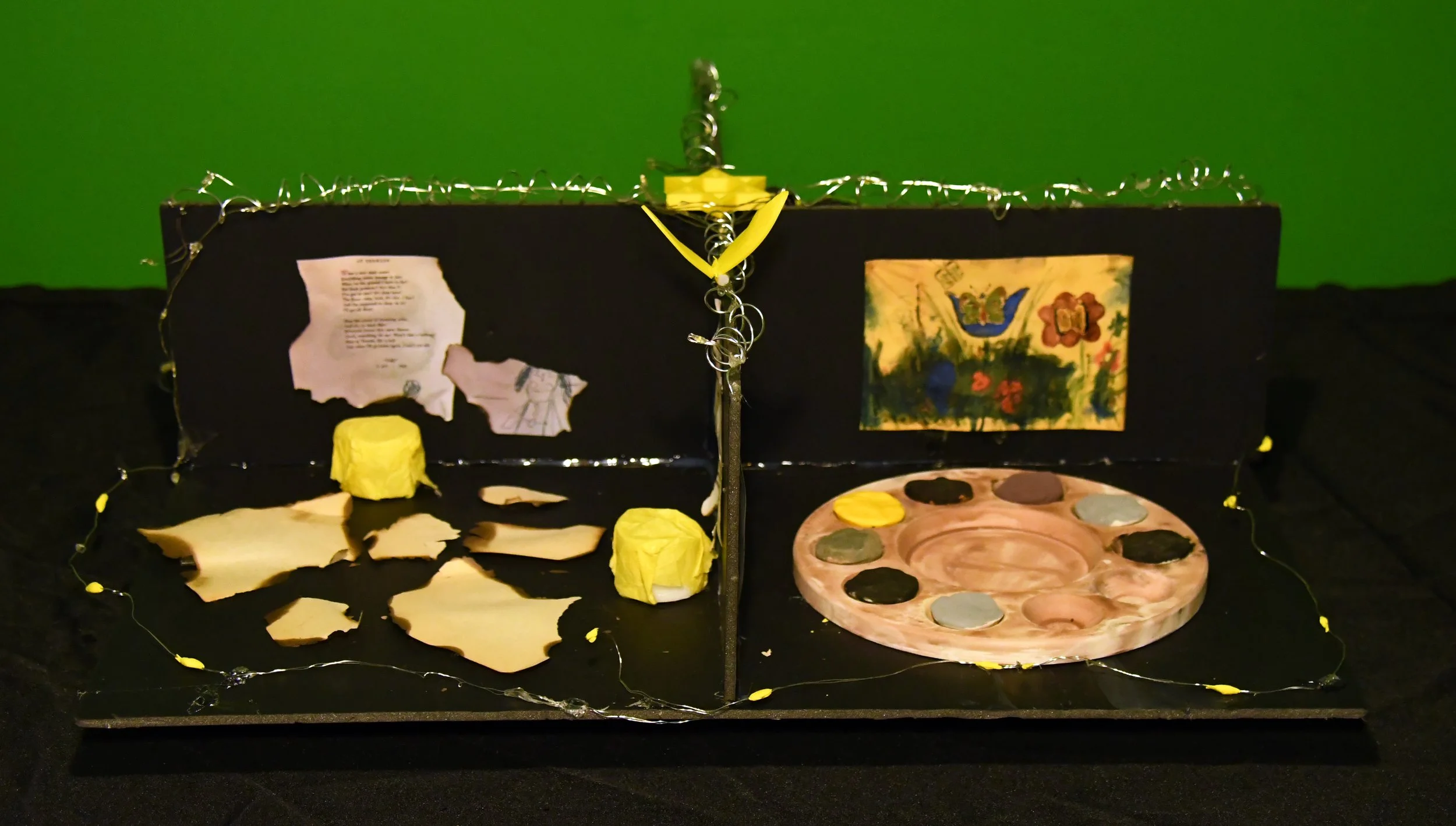 Throughout our memorial we used black poster board for the walls to create a feeling of confinement and darkness. The brown paint palette and violin stand out against the black background, creating slight contrast. The yellow symbols in each section created strong contrast against the brown and black elements, representing that bit of hope that still existed. The rough texture of the barbed wire represents the harsh conditions jews endured, while the lights represent the cultural pride that art brought to the prisoners.